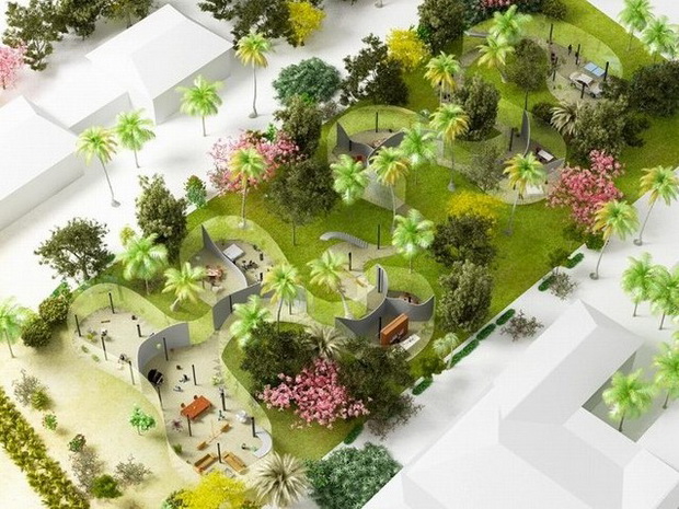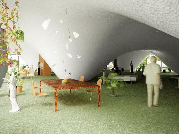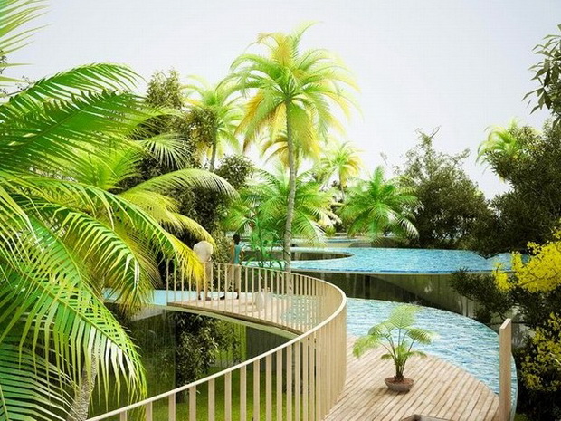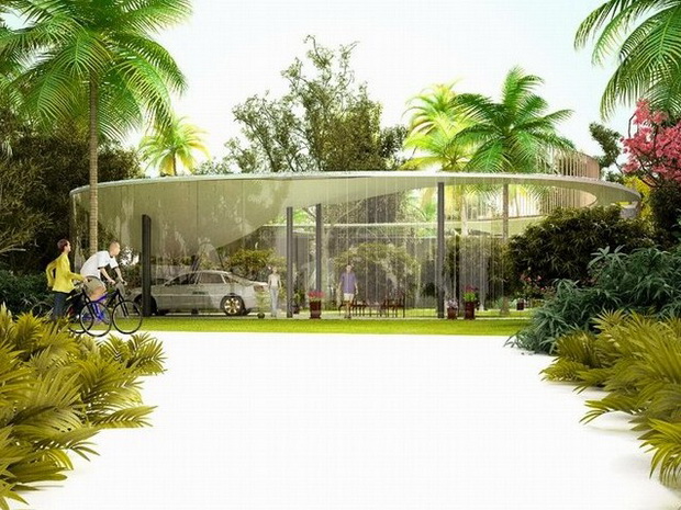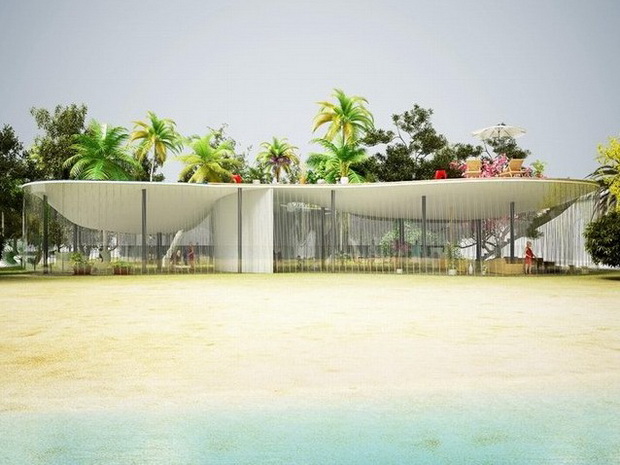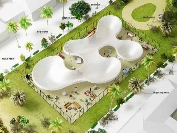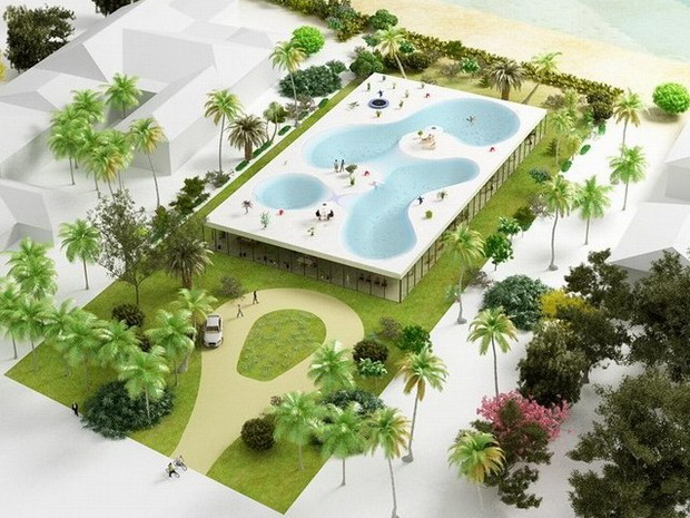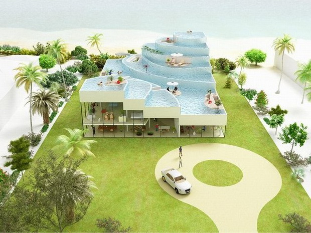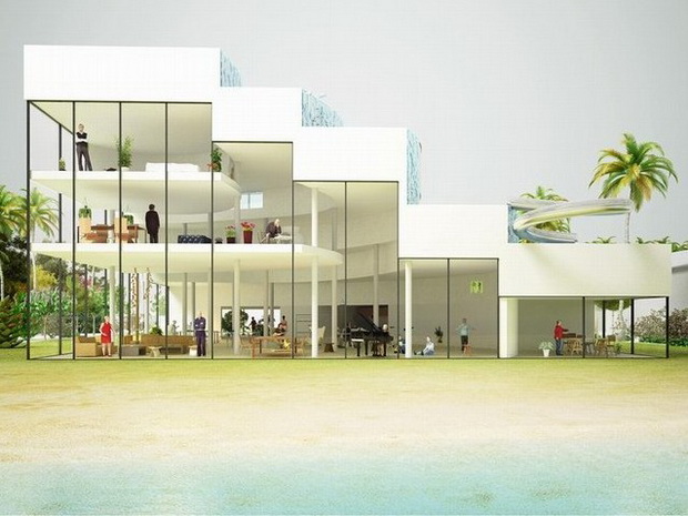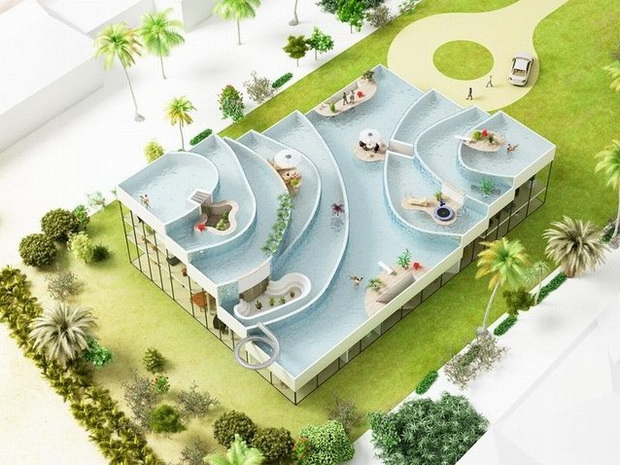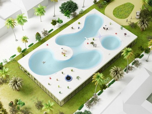 來自荷蘭的NLarchitects建筑事務所總能為我們帶來不一樣的新奇想法,很快他們設想了三個方案。都是將泳池架設在住宅的屋頂,房子的生活區位于泳池下面,以通透的玻璃幕墻圍合。通過泳池的不同形狀與深度劃分出下面的空間,上面的泳池儼然成為一個水上樂園!